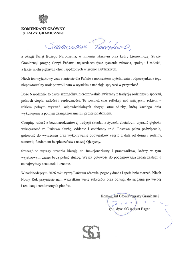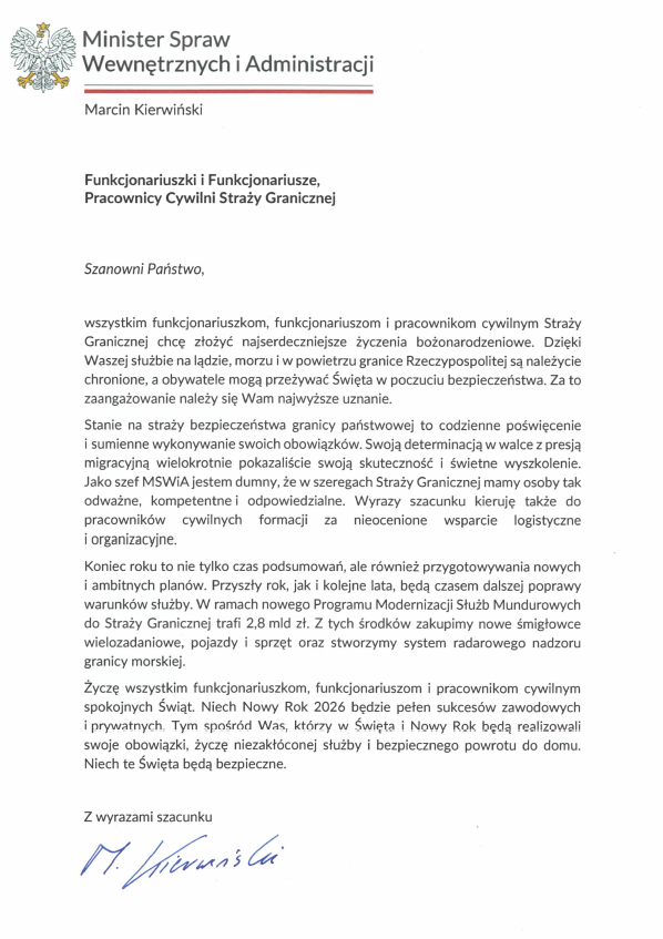Życzenia świąteczne Ministra Spraw Wewnętrznych i Administracji oraz Komendanta Głównego SG.