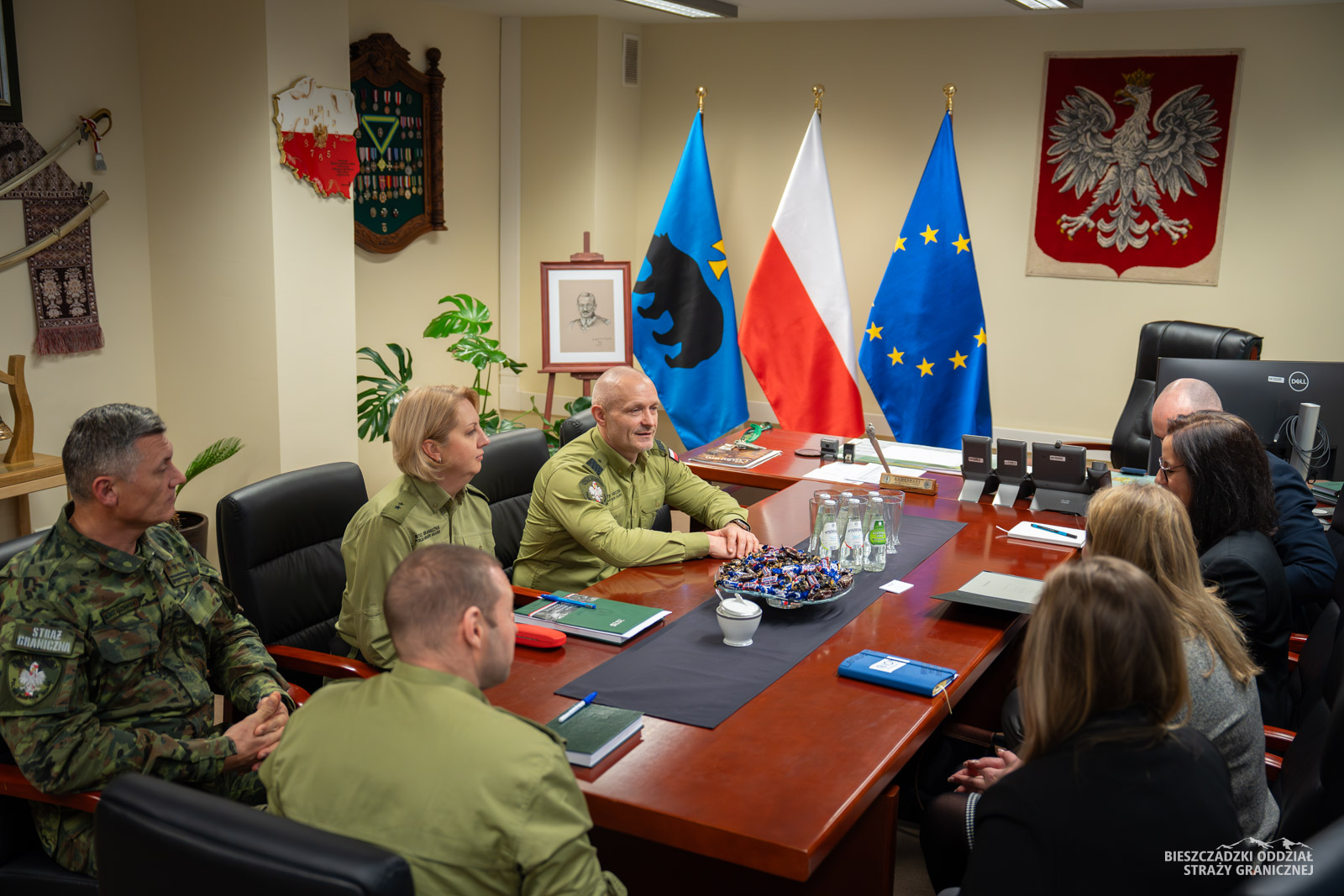 28 stycznia do komendy BiOSG przybyła Livia Styp-Rekowska – Szefowa Misji IOM w Polsce wraz z delegacją. Podczas spotkania z Komendantem Oddziału, gen. bryg. SG Tomaszem Zybińskim oraz zastępcą Komendanta właściwym ws. granicznych, płk. SG Markiem Soliszewskim poruszono zagadnienia dotyczące współpracy, w tym wyzwania z jakimi funkcjonariusze mierzą się w kontekście przepływów granicznych, a także omówiono możliwości kontynuowania partnerstwa, szczególnie w zakresie przyszłych naborów projektowych. Komendant przybliżył zasady odprawy podróżnych na polsko-ukraińskich przejściach granicznych. Zwrócił również uwagę na nowy system EES, umożliwiający identyfikowanie obywateli państw spoza UE.