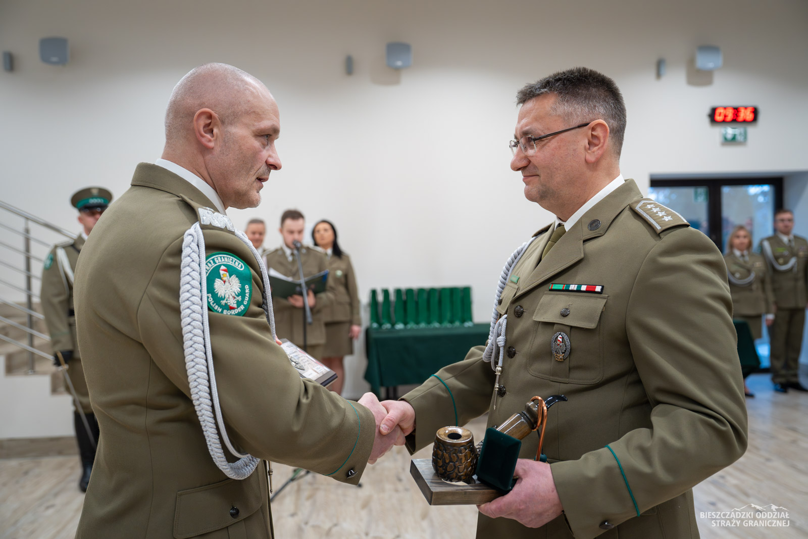 Uroczystość odbyła się 12 lutego w auli komendy BiOSG. W asyście pocztu sztandarowego odśpiewano hymn państwowy. W zbiórce uczestniczyła kadra kierownicza BiOSG, funkcjonariusze oraz pracownicy oddziału. Za wieloletnią służbę strażnikom granicznym podziękował Komendant oddziału, gen. bryg. SG. Tomasz Zybiński. Część mundurowych odchodzących na emeryturę została mianowana na wyższe stopnie służbowe w korpusie oficerskim. W dowód uznania za wzorowo wypełnianą służbę płk SG Jacek Siara, płk SG Mariusz Krzyśkowski oraz ppłk SG Artur Lewicki otrzymali szable oficerskie. Żegnających się ze służbą uhonorowano okolicznościowymi wyróżnieniami i pamiątkami.